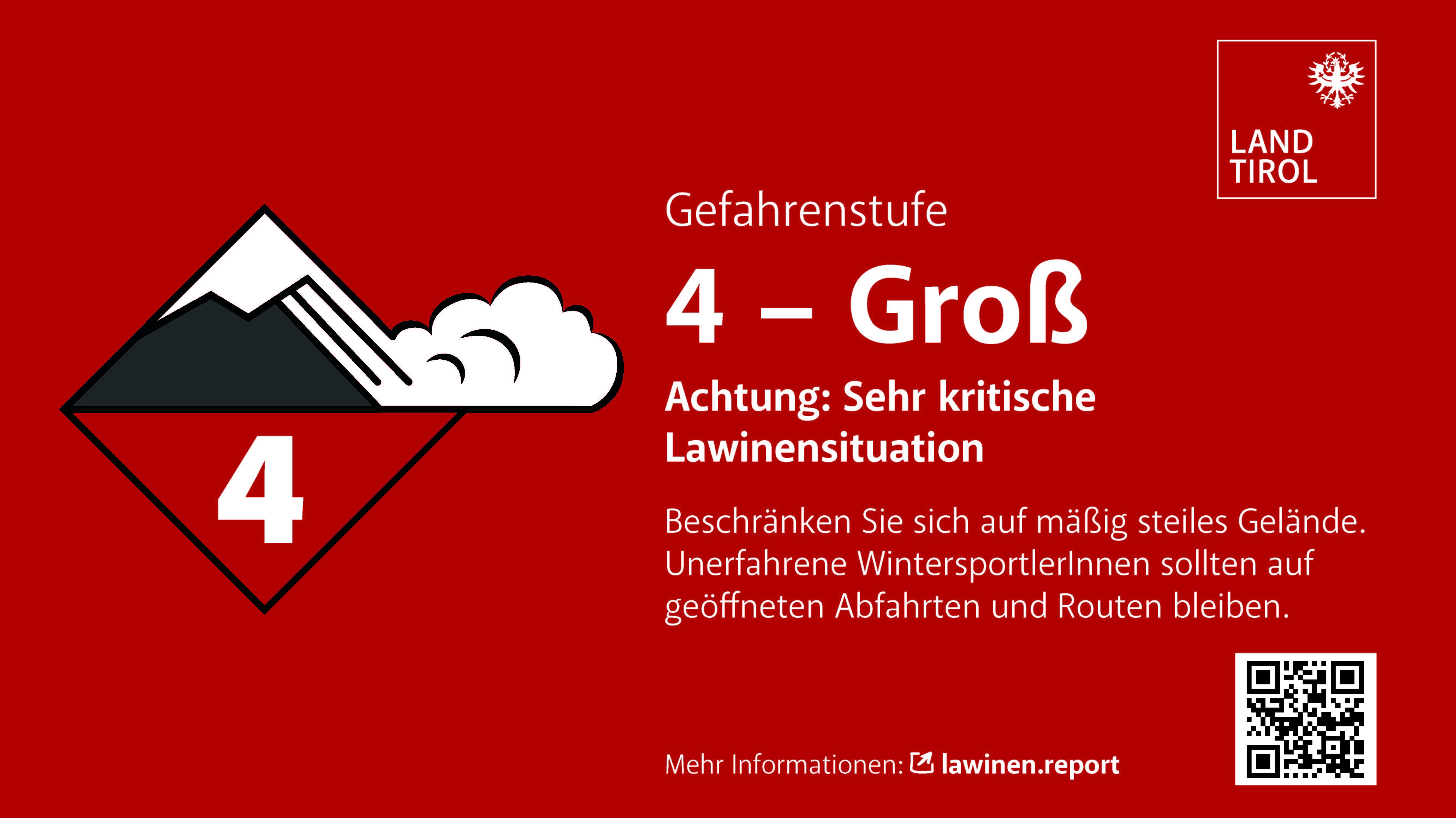 Aufgrund der prognostizierten Neuschneemengen von stellenweise über 50 Zentimeter Neuschnee gibt der Lawinenwarndienst des Landes Tirol ab morgen, Dienstag, für Teile Tirols die zweithöchste Lawinengefahrenstufe (Stufe 4 – große Lawinengefahr) oberhalb der Waldgrenze aus.